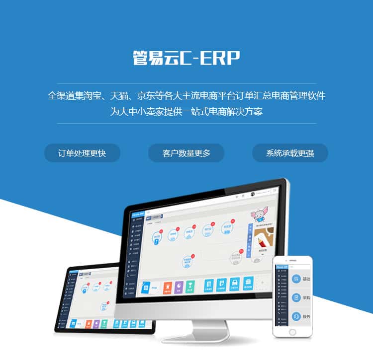 管易云C-ERP是金蝶集团旗下专注提供电商企业管理软件子产品,以SAAS模式打造,快捷方便,简单易操作。软件以订单为中心,为电商各行业类目的客户提供明确的模块化协同操作,提供采购、库存、售后及财务等环节的管控,帮助客户提升业务处理能力及行业竞争力。是为中小型电商企业量身定制的整体性解决方案。